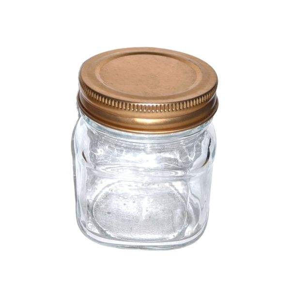 Pot en verre transparent durable avec couvercle métallique hermétique, idéal pour conserver les épices fraîches et bien rangées sur les étagères de cuisine.