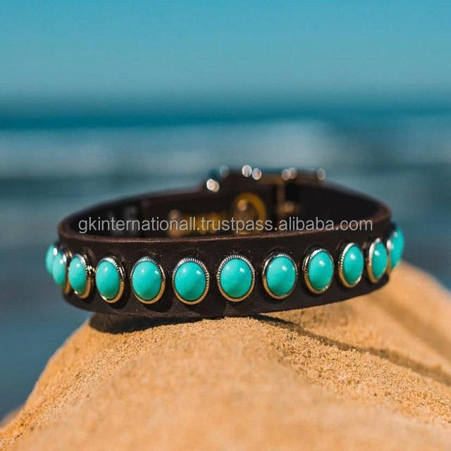 Collier de chien en cuir cousu, nouveau design, permanent, turquoise, concho, décoratif, entièrement neuf, commande en vrac incluse