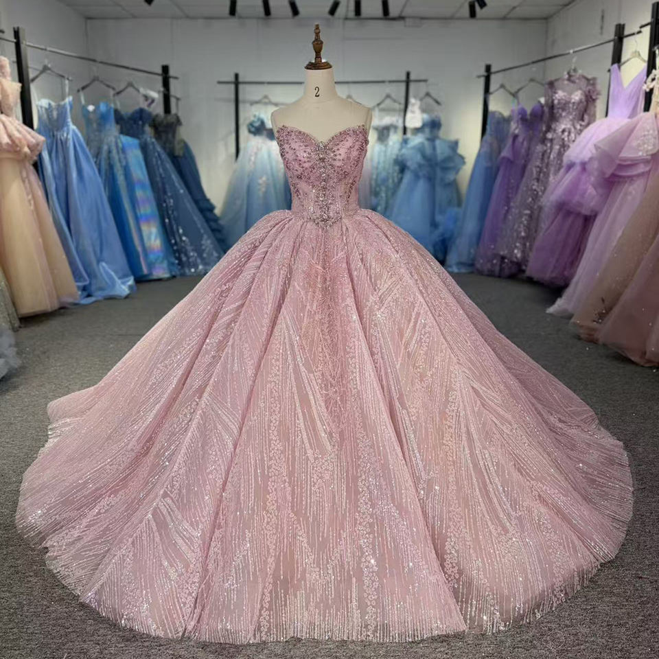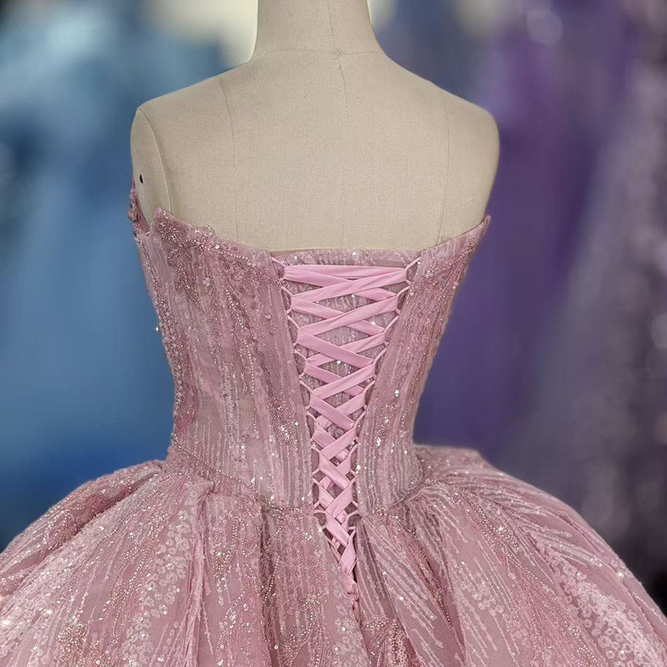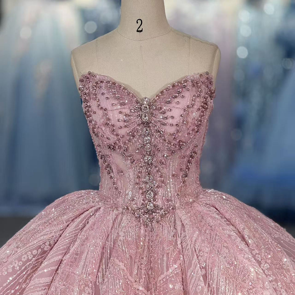 Robe de bal et de Quinceañera élégante et scintillante, style princesse, en mousseline rose, avec appliques, bustier et perles de diamant, pour soirée.