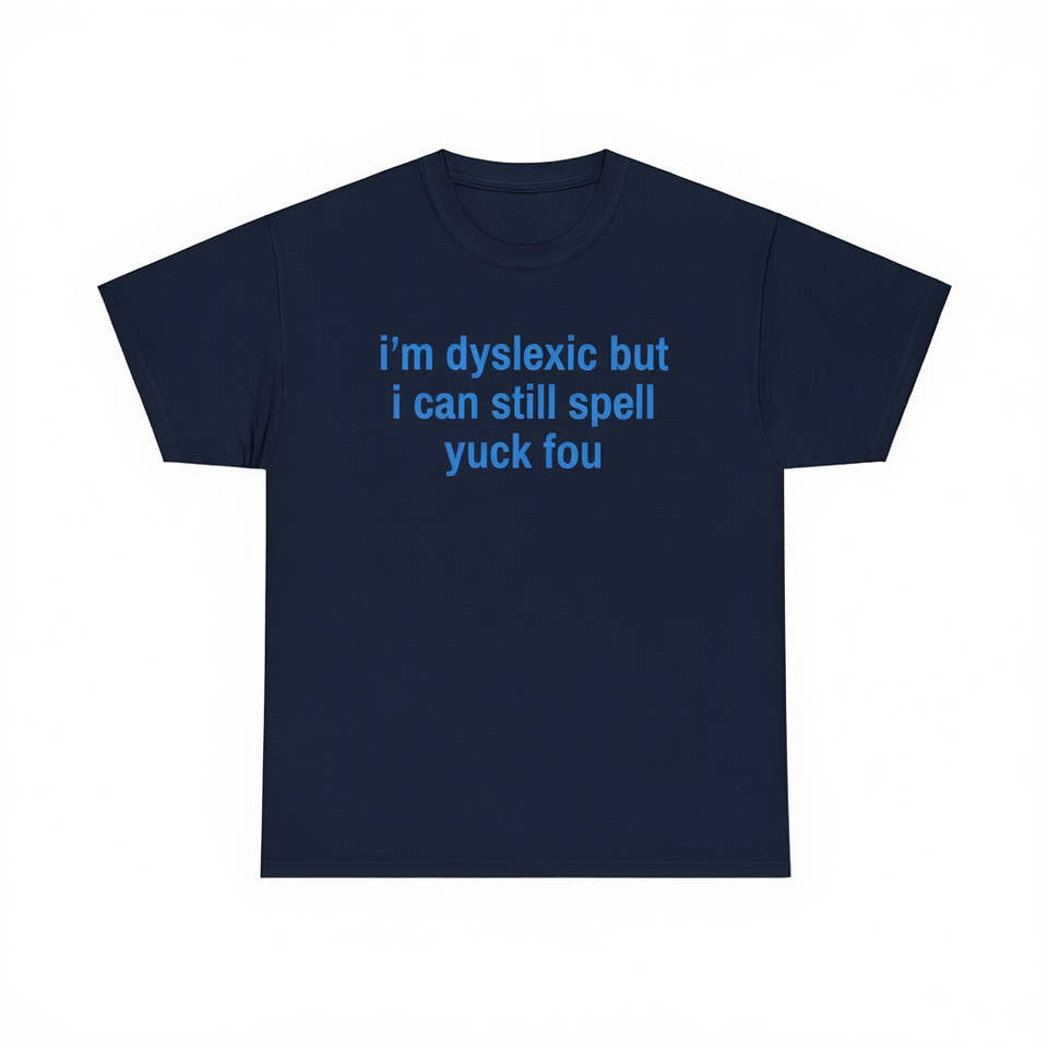 T-shirt promotionnel ironique et drôle pour papa, avec le slogan « Dyslectique mais je peux quand même écrire Yuck Fou »