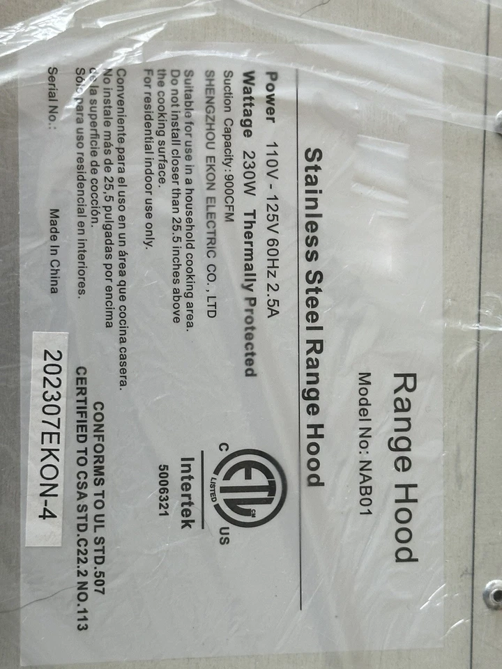 Hotte aspirante encastrable E-k-o-n R-a-n-g-e H-o-o-d I-n-s-e-r-t 36i-n.900 C-F-M pour cuisine