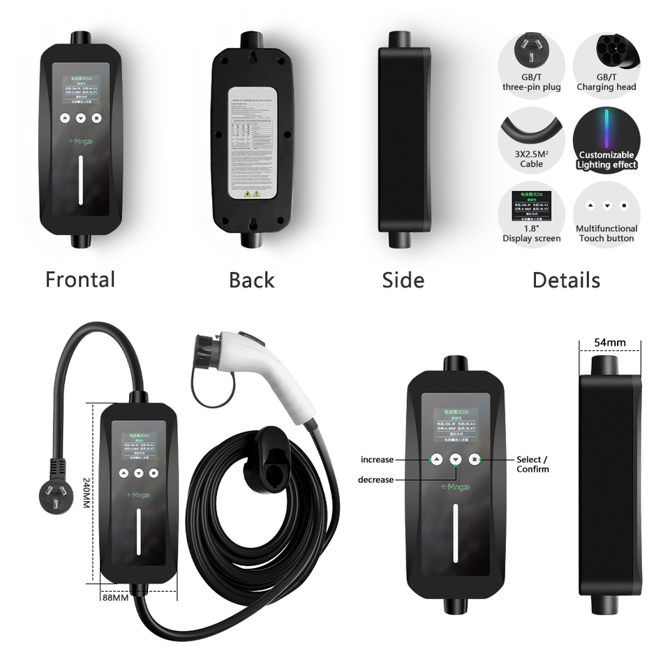 E-mingze meilleur prix Ip 66 10a 16a 32A ajuster le chargeur Ev portable chargeur Ev portable réglable GBT chargeur de voiture de véhicule électrique