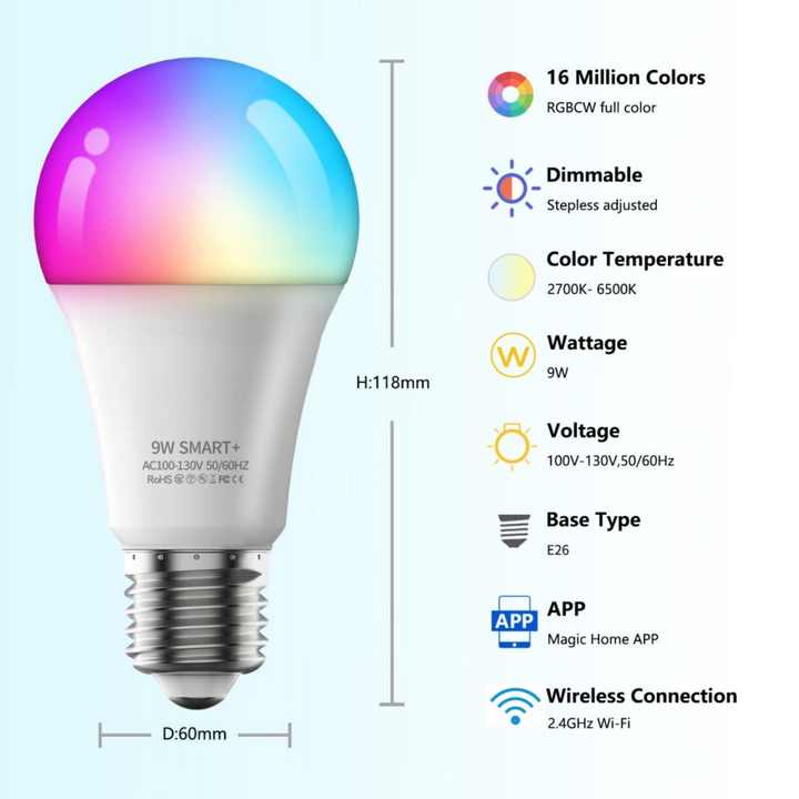 Ampoule LED intelligente E26/E27 9W, ampoule LED WiFi, lumière LED RGB multicolore, ampoule à intensité variable