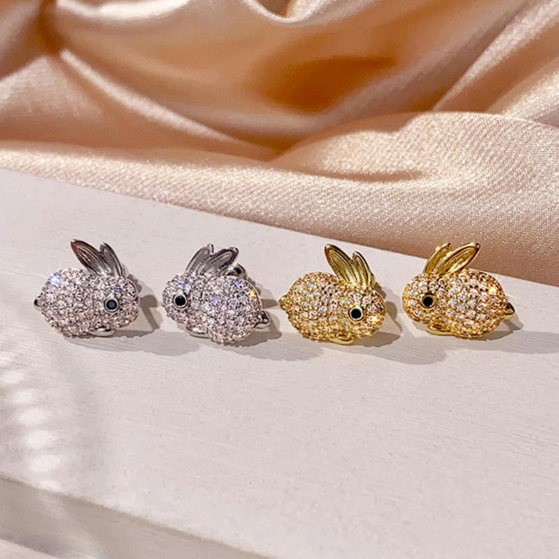 Boucles d'oreilles clous en or blanc E3370, motif lapin, micro-incrustation de strass en cristal, design animal mignon, unisexe, pour usage quotidien