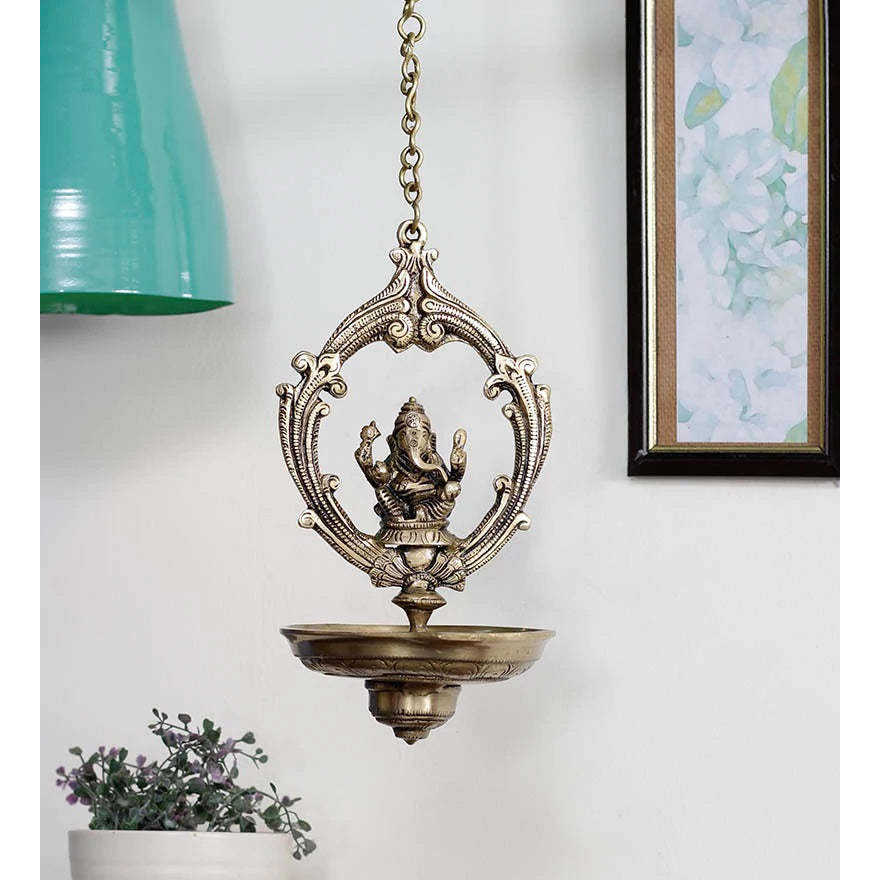 One Brass Lord Ganesha Hanging Oil Wick Diya - 22Inch Long ChainPackage Content