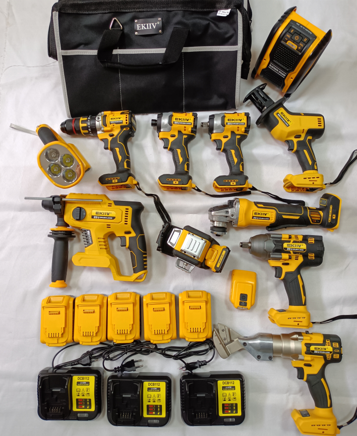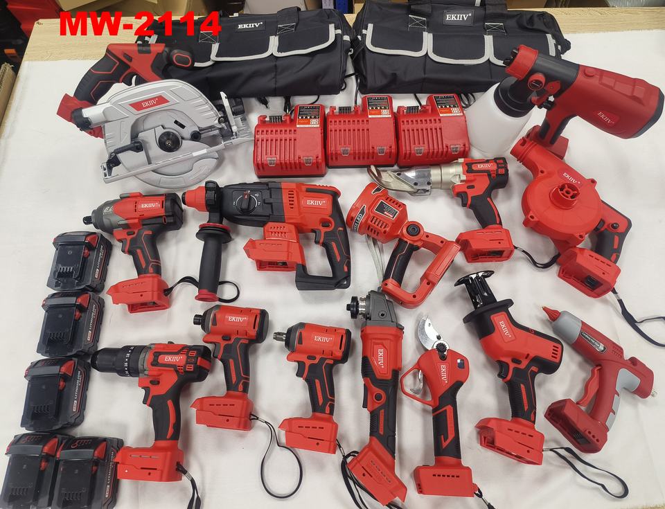13mm cordless impact drill, cordless brushless screwdriver, cordless brushless wrench, 125mm cordless angle grinder, 18 inch bag, 5*4.0Ah Batteries, 3* Fast Seat Charger, cordless brushless 26mm rotary hammer, cordless brushless saber saw, cordless brushless twig scissor, cordless 700Nm large troque impact wrench, cordless brushless blower, cordless LEd light, cordless sprayer, cordless brushless circular saw