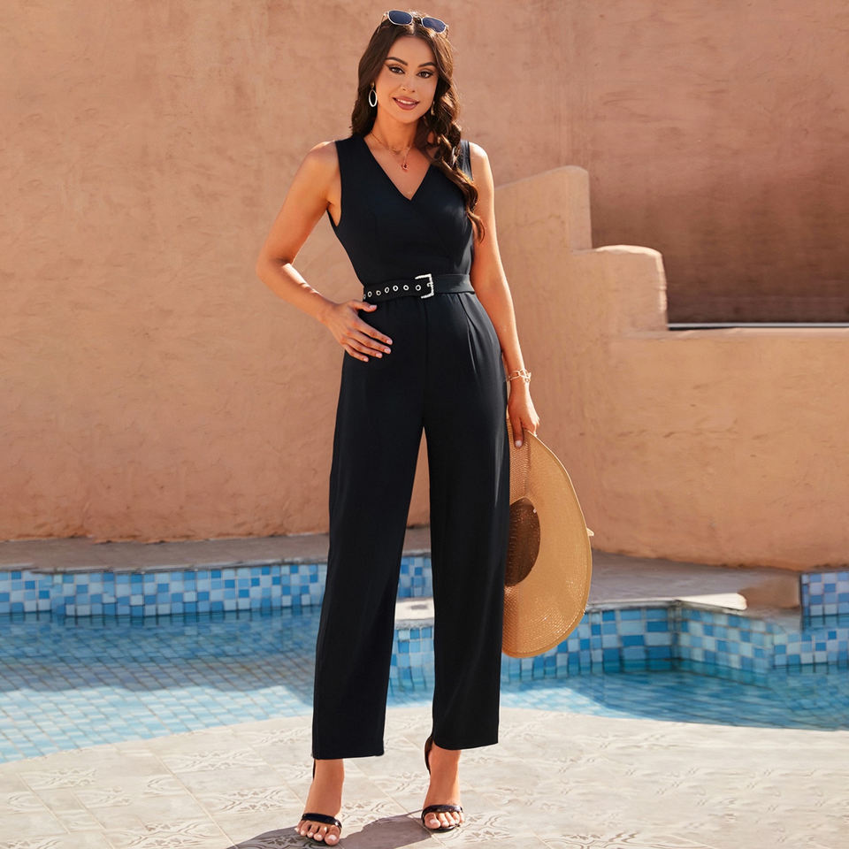 Combinaison élégante à taille haute, décontractée, respirante, de couleur unie, à jambes larges avec ceinture pour femmes