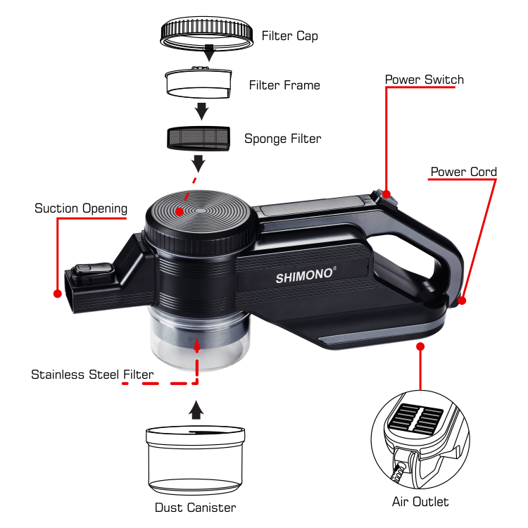 Technologie du cyclone, Nettoyage facile, Léger, Portable, Filtre lavableCaractéristique