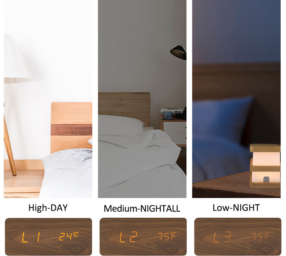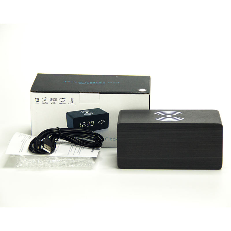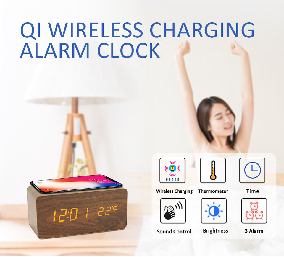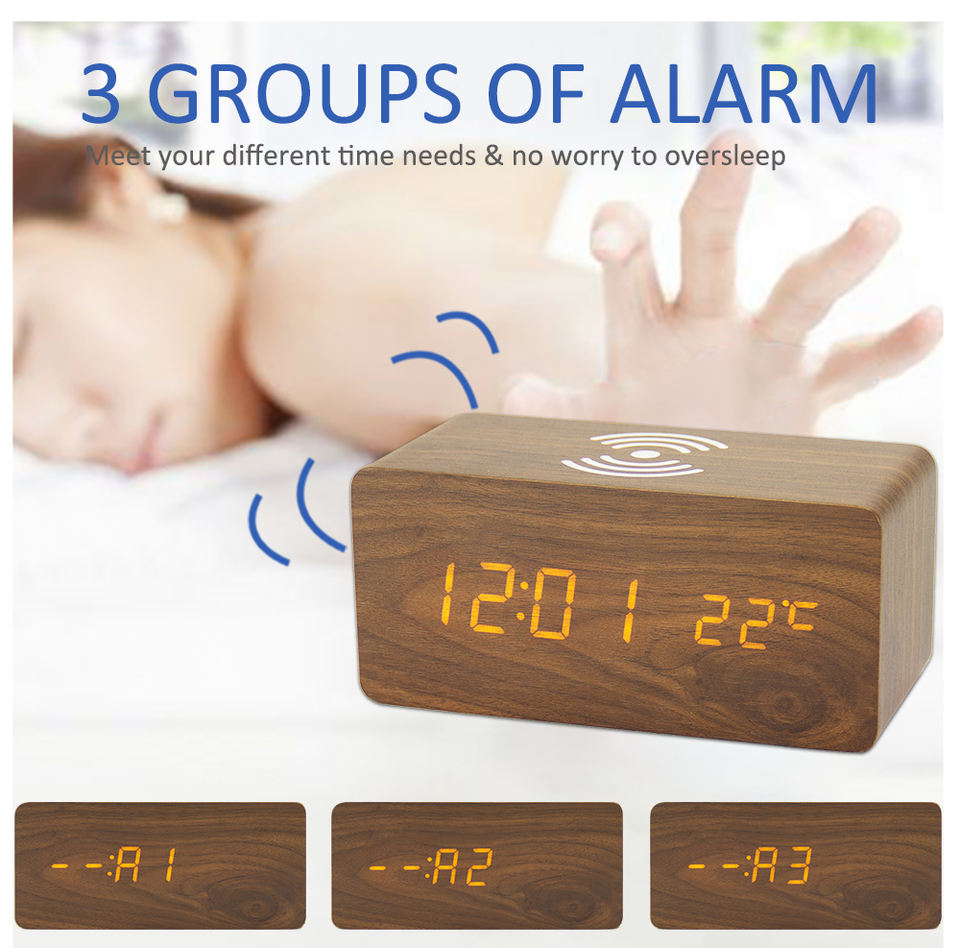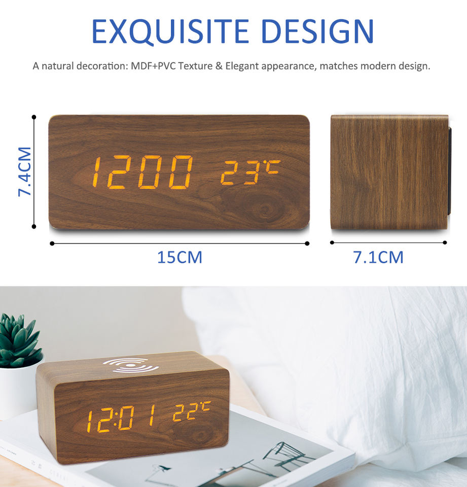 Réveil numérique en bois de bureau électronique avec chargeur sans fil, réglage de la luminosité, décoration de la maison EMAF