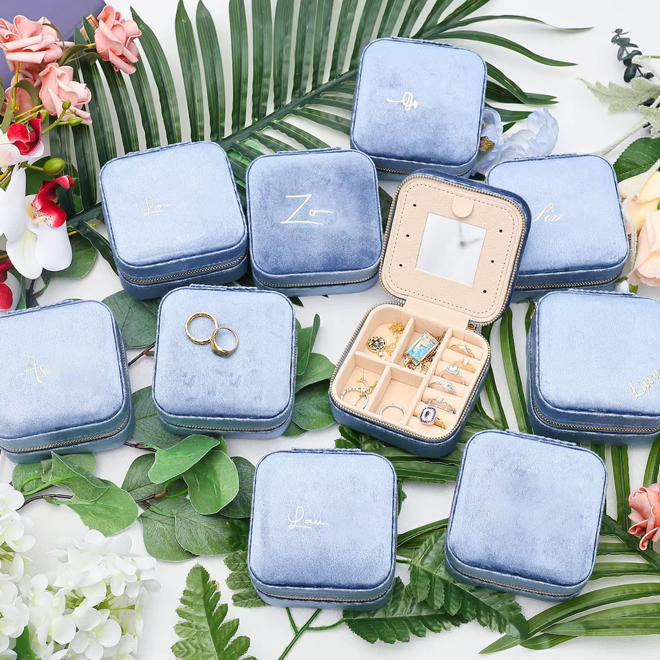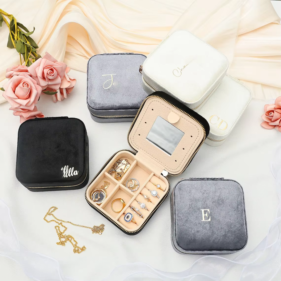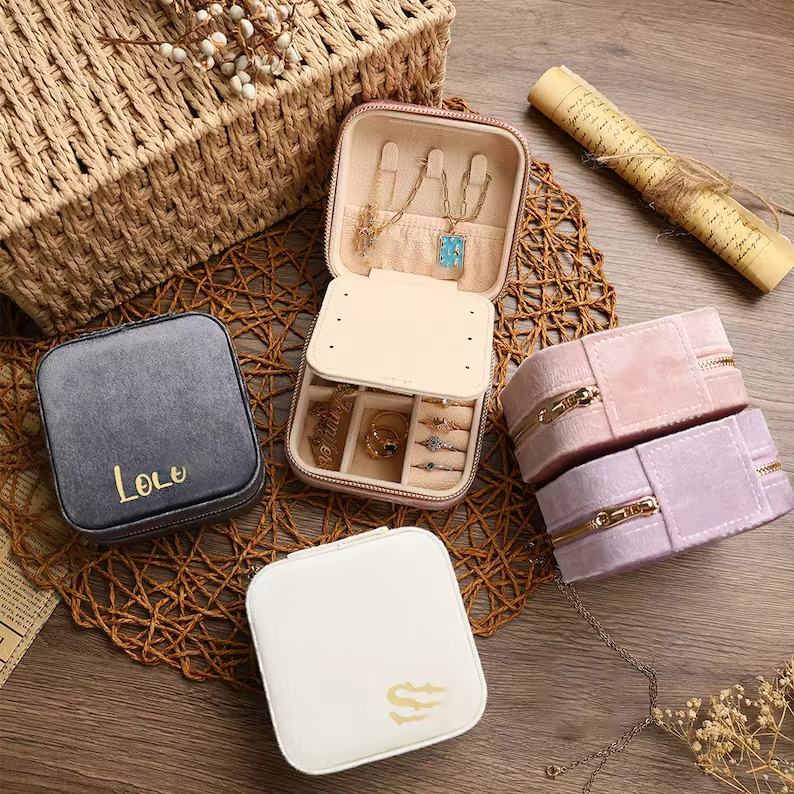 Boîtes de rangement pour bijoux rectangulaires personnalisées avec logo EQ, fermeture à glissière, étui de voyage portable pour bagues, design simple et élégant