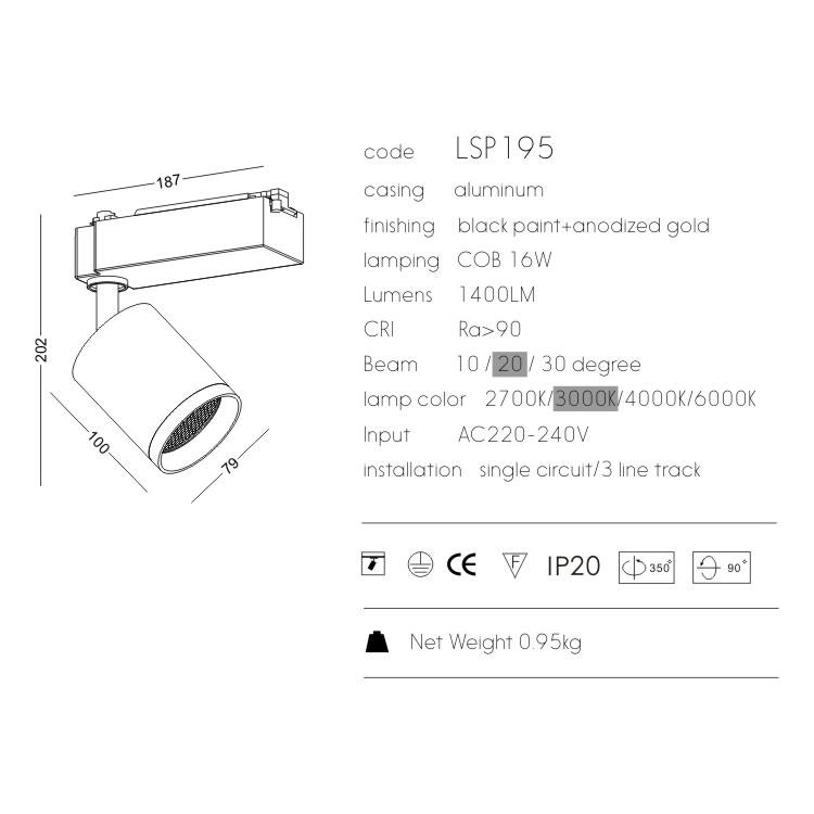 Rail de lumière pour marché européen, spot LED sur rail 9W avec filtre en nid d'abeille, lumière LED sur rail COB