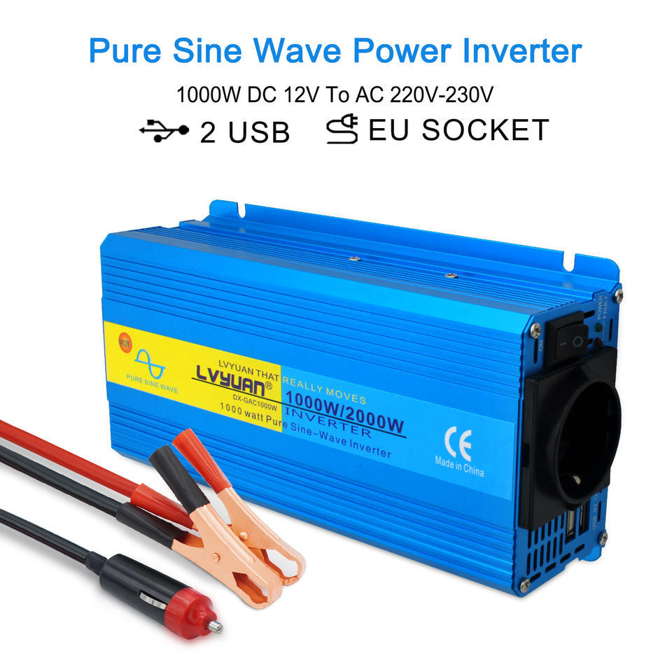 Onduleur de voiture à onde sinusoïdale Pure 1000W, convertisseur de signal électrique de camping, double sortie USB, 12V/24V DC à AC 220V/230V, 2kva