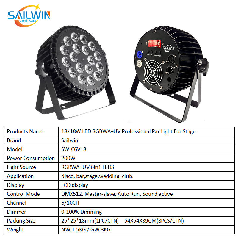 Stock UE Lumière de scène LED Sailwin 18X18W RGBAW UV Aluminium DMX512 LED Par Light pour événement de mariage PAR64