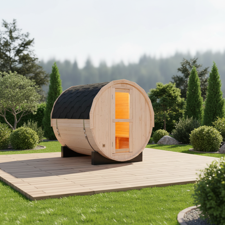 Sauna extérieur moderne en pin massif blanc écologique pour 4 à 6 personnes, avec four électrique de 6 kW, modèle 1