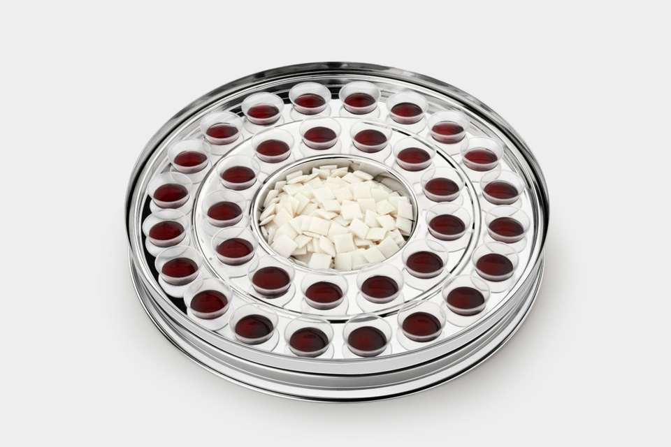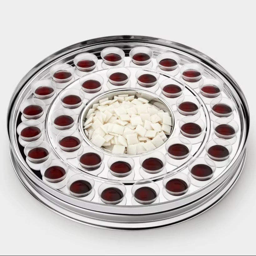 Plateau de Communion Combo EXCLUSIF en Acier Inoxydable Durable, 33 Coupelles, Centre pour le Pain, Finition Miroir, SANS COUVERCLE, SANS BORD INFERIEUR, Usage Écclesiastique