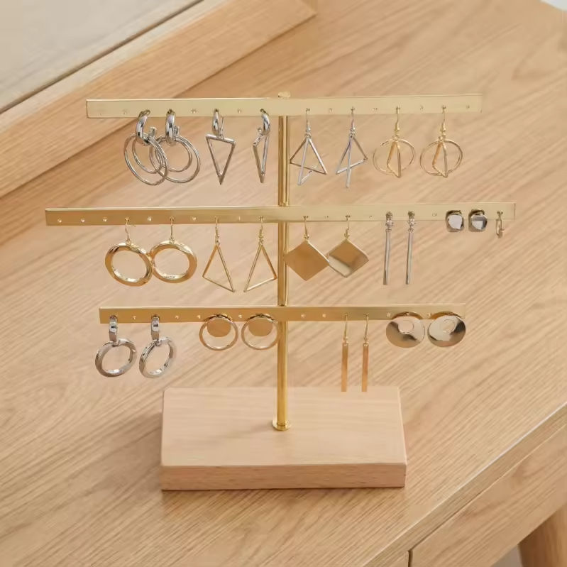 Présentoir à Boucles d'Oreilles en Métal à 3 Niveaux, Organisateur de Bijoux avec Base en Bois, Plateaux Personnalisables