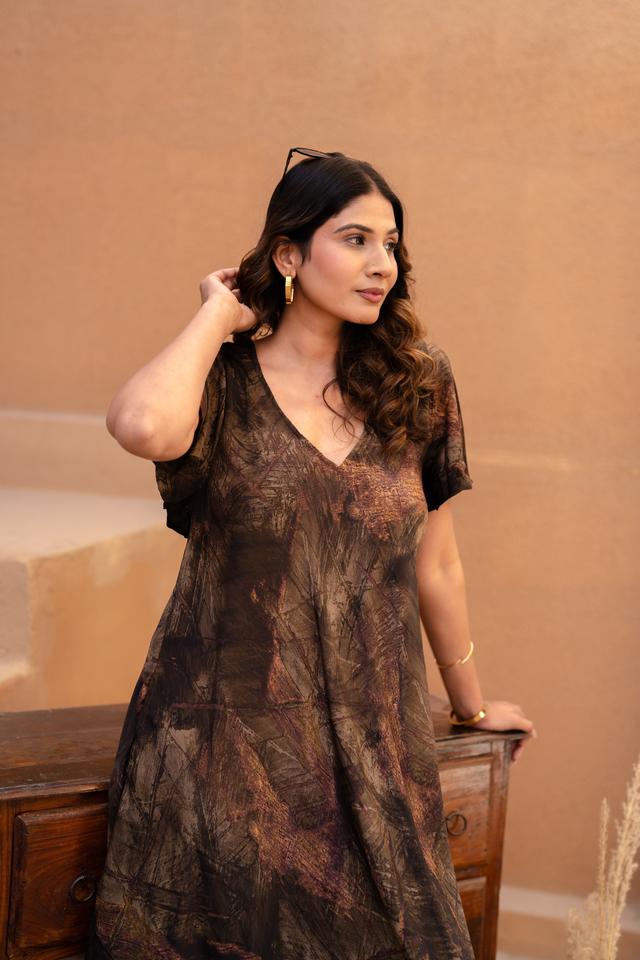 Robe d'été mi-longue à col en V, imprimé abstrait terreux, manches bouffantes, tons doux, style bohème modeste, tenue de villégiature aux tons neutres, taille naturelle