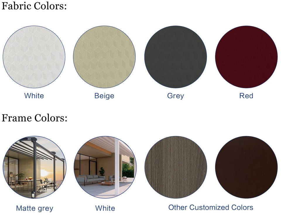 Optional Accessories:Glass Sliding Door; Rain Sensor; LED Light; Side Rolling Blind