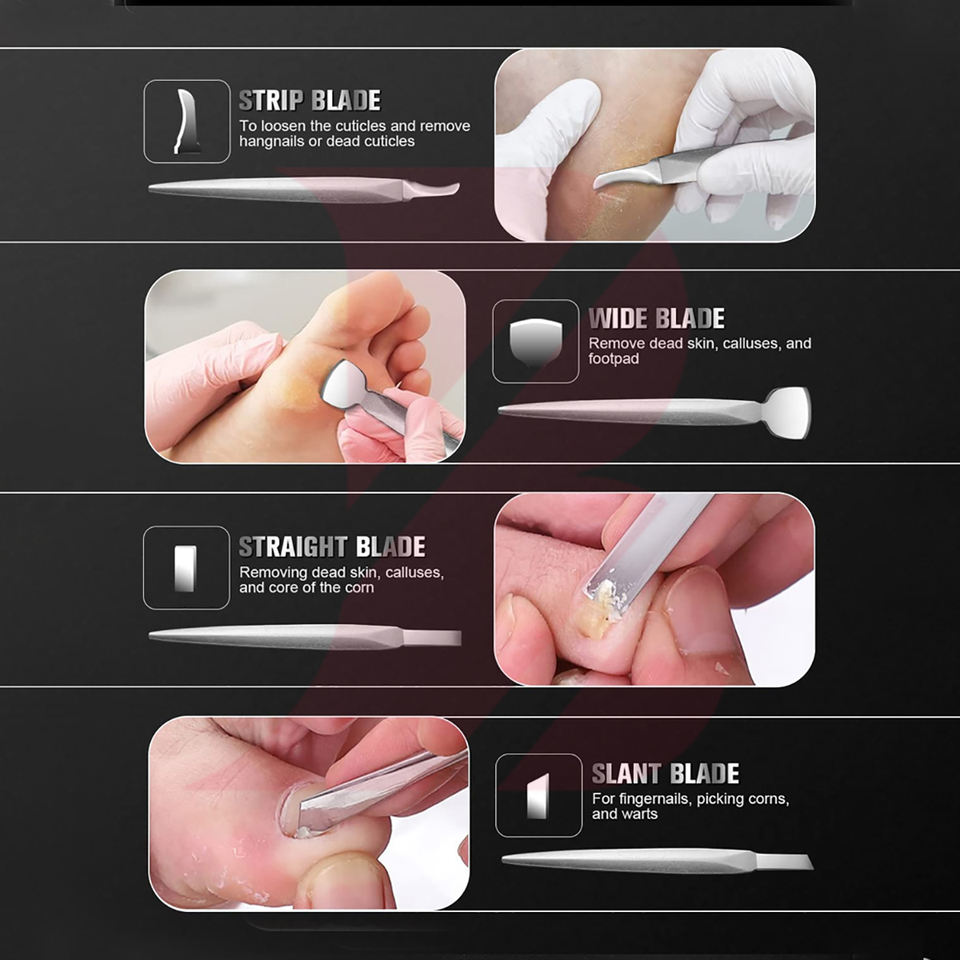 Ensemble d'instruments de podologie en acier inoxydable de qualité supérieure, entièrement personnalisés, faciles à utiliser et de qualité supérieure, pour les soins personnels.