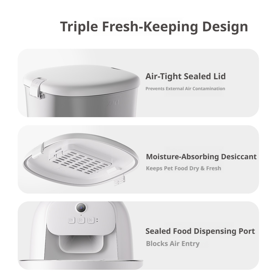 Alimentation programmée, Contrôle via application, Enregistrement vocal, Anti-obstruction