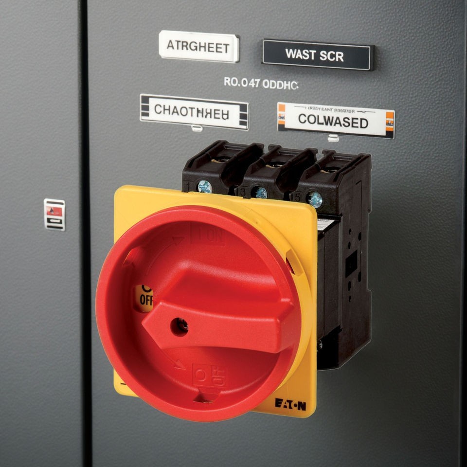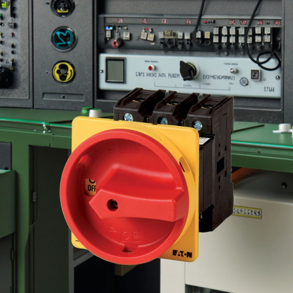 Interrupteur principal Eaton série P3, P3, 63 A, montage arrière, 3 pôles, avec poignée rotative rouge et anneau de verrouillage jaune