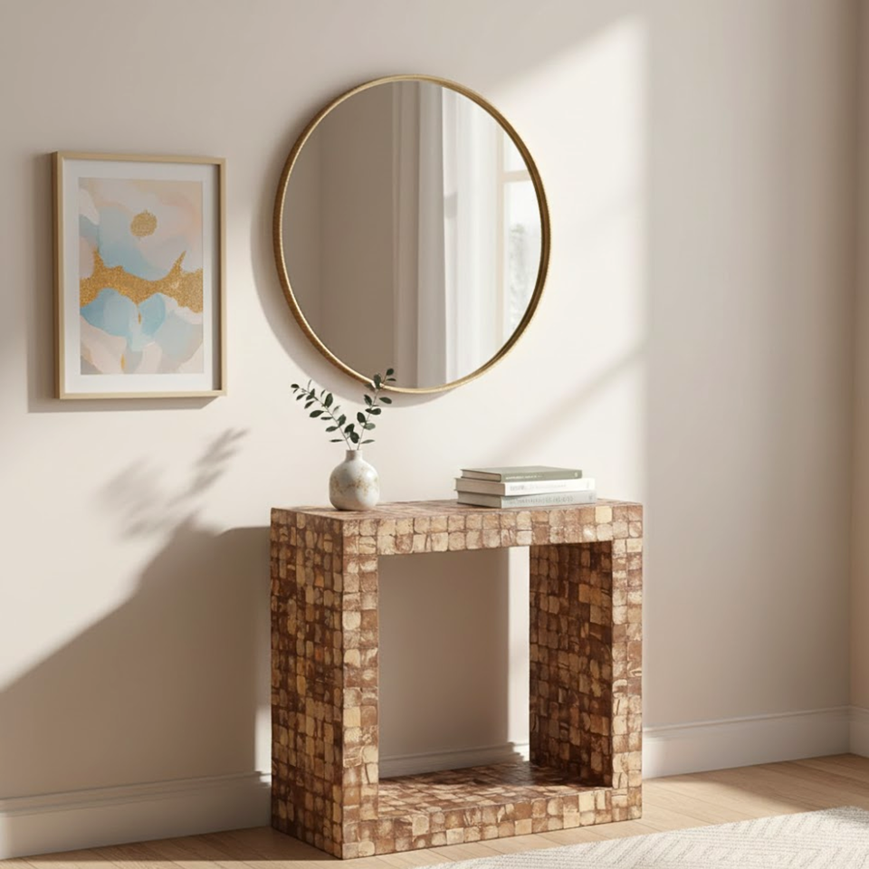 Table d'appoint éco-chic avec finition en coquille de noix de coco brun rustique, style farmhouse, table d'appoint pour salon, fabrication vietnamienne