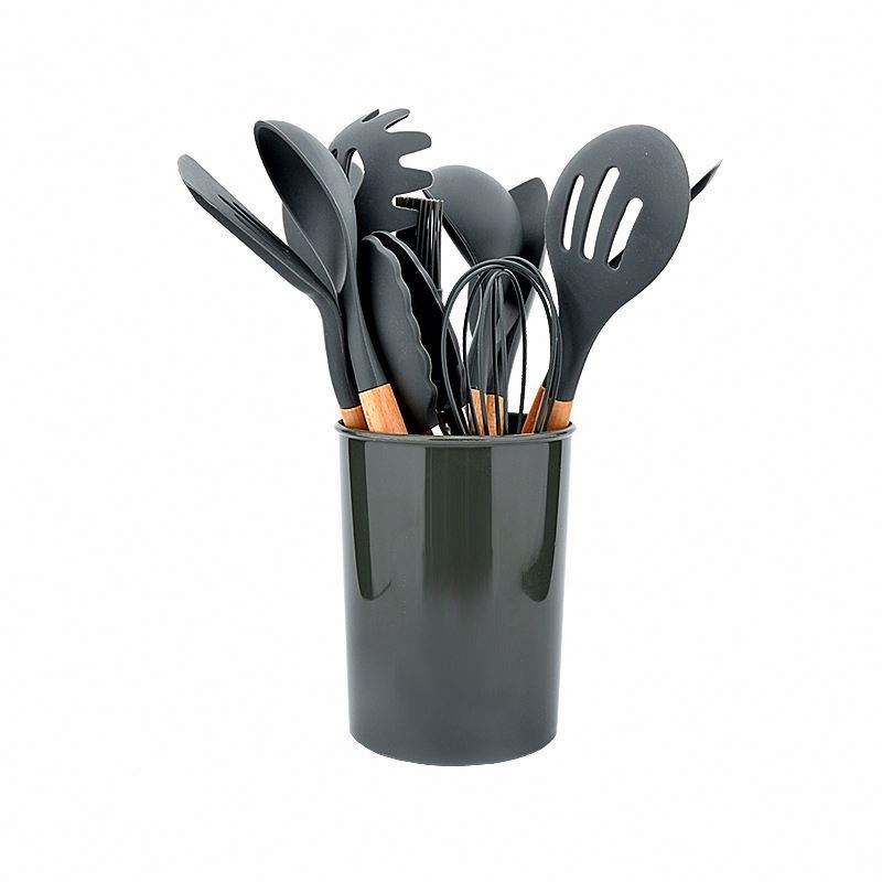 Ensemble d'ustensiles de cuisine en silicone écologiques de 12 pièces avec seau de rangement à poignée en bois et spatule en silicone par USA Mairun