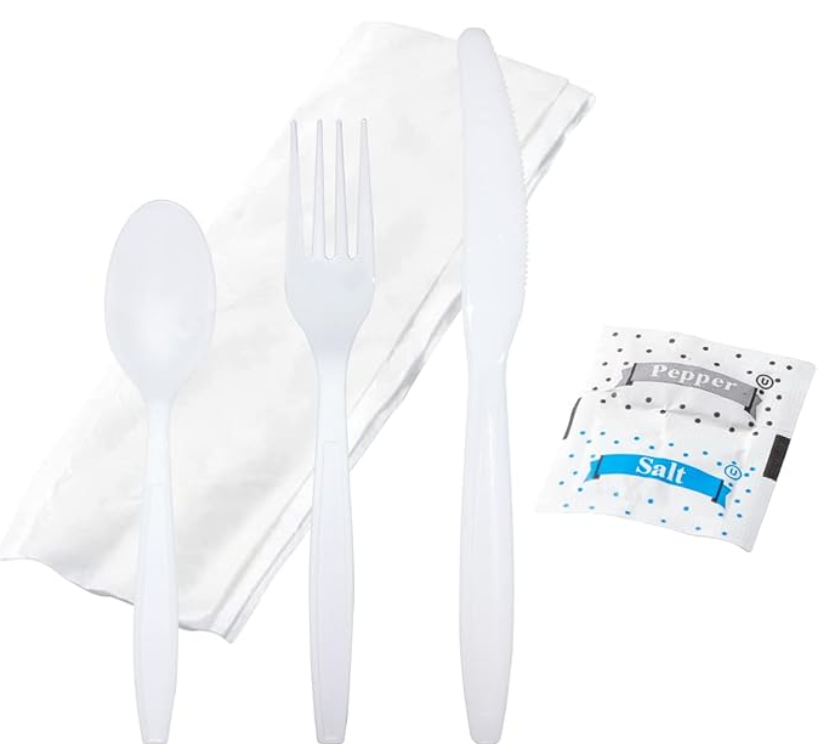Ensembles de couverts jetables biodégradables écologiques – Couteau, fourchette, cuillère, serviette, sel, poivre, emballés individuellement, sans BPA, pour fêtes