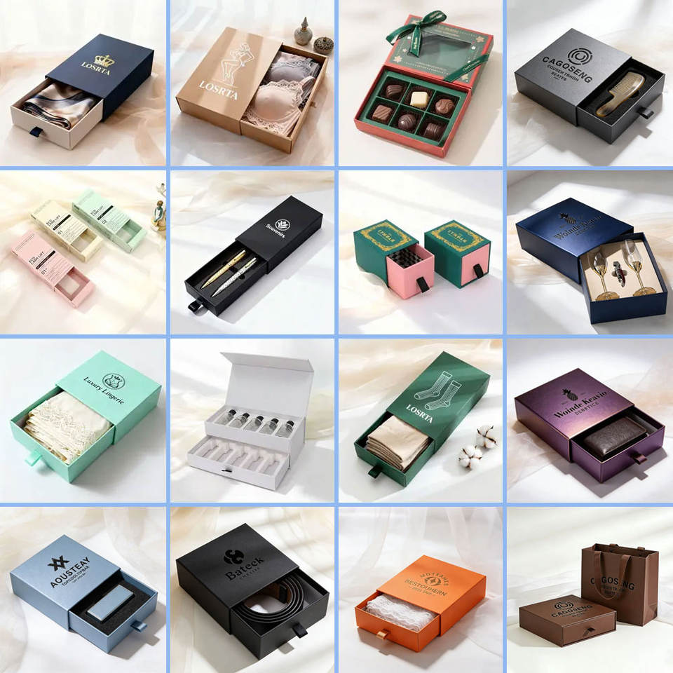 Boîte cadeau écologique biodégradable haut de gamme, personnalisée avec logo imprimé, en carton coulissant avec insert en EVA et ruban