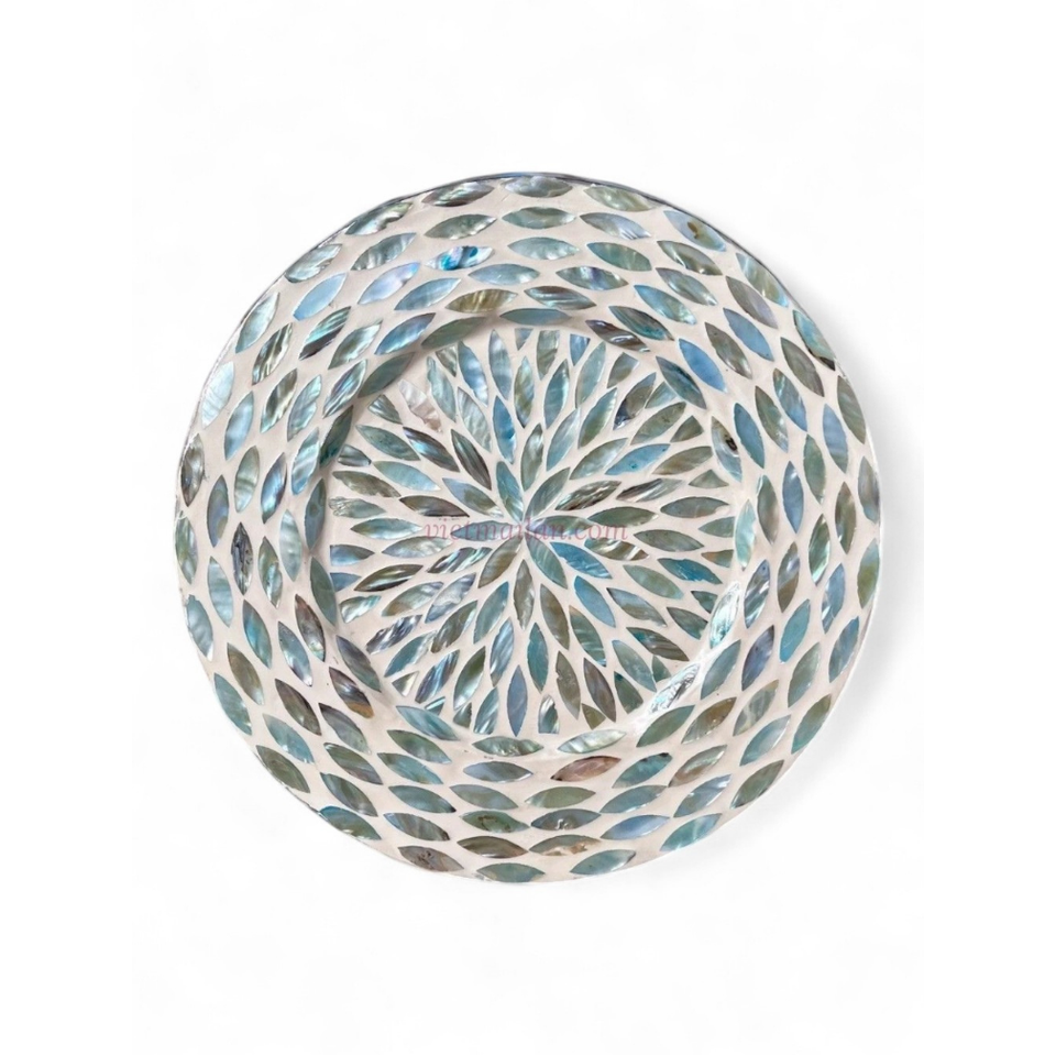 Assiette de présentation de luxe écologique en coquille bleue avec cœur en bambou nacre pour décoration de table de mariage durable, fabriquée au Vietnam