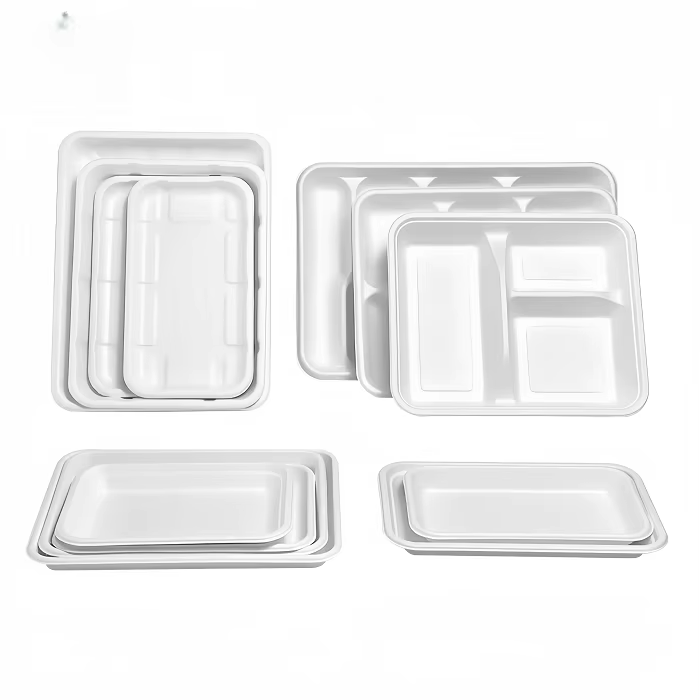 Vaisselle jetable écologique et compostable en bagasse de canne à sucre avec plateau, ensemble de service alimentaire biodégradable pour événements et traiteurs