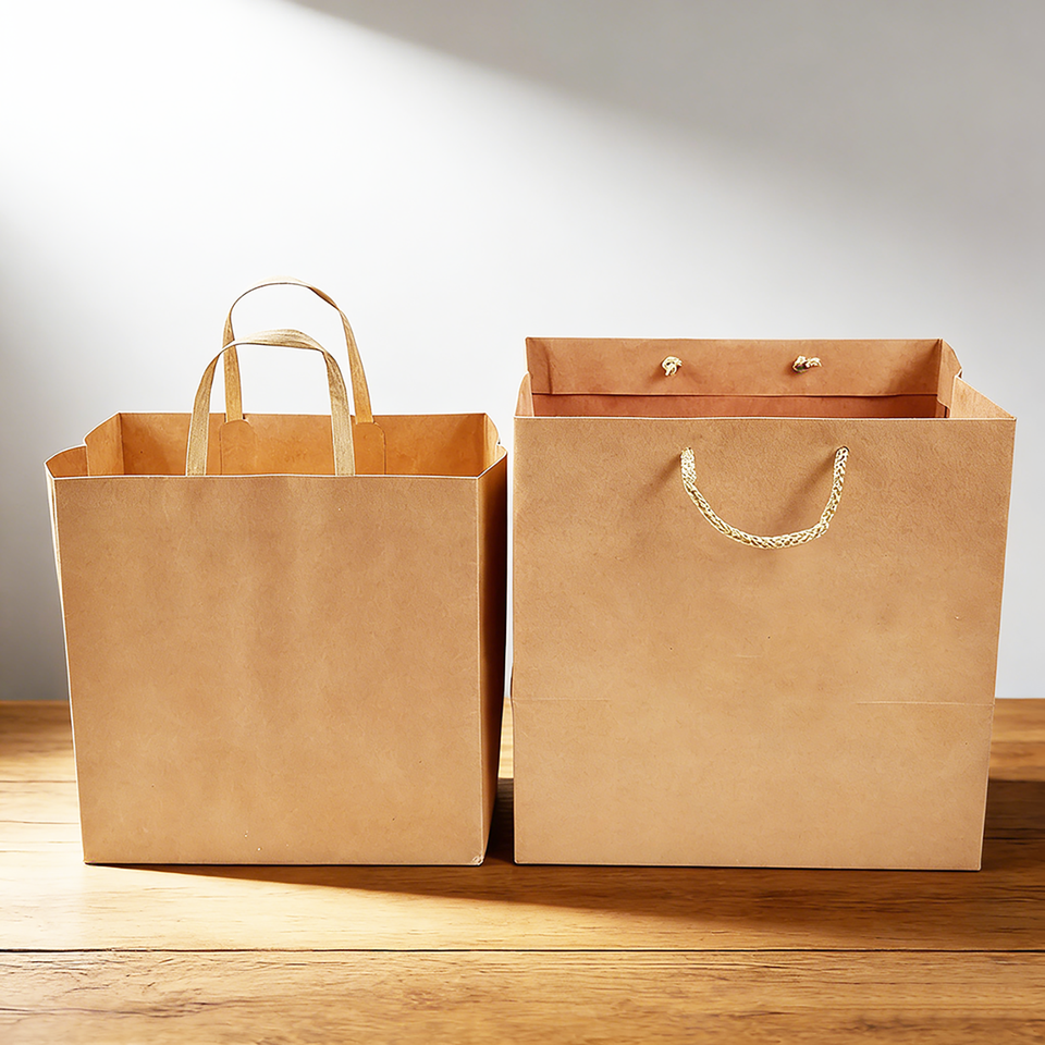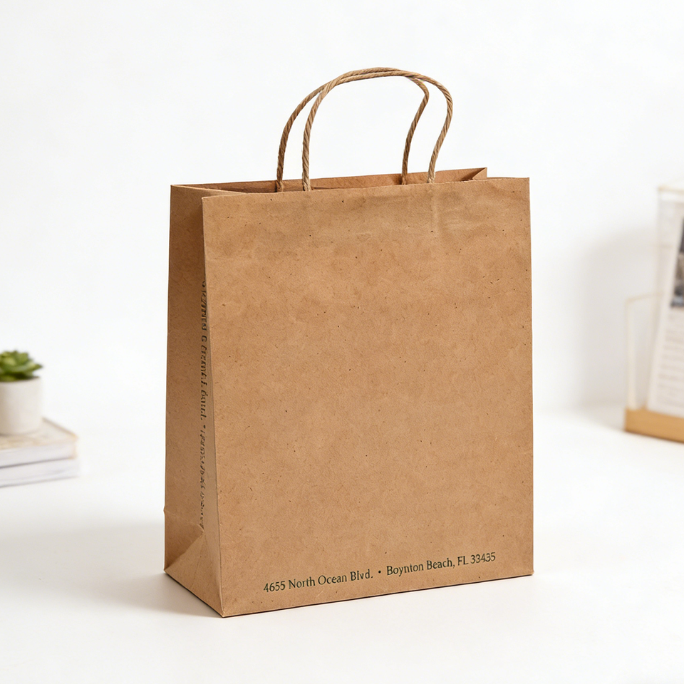 Sac cadeau en papier kraft écologique personnalisé avec poignée torsadée plate, sac d'emballage pour boutique, fournisseur d'impression OEM