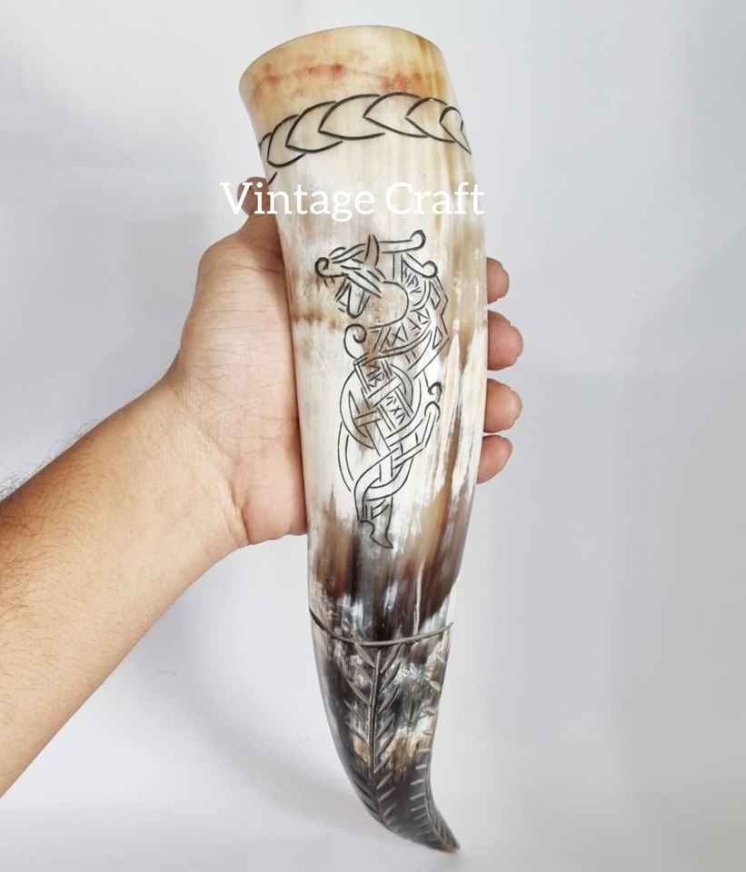 Corne à boire viking sculptée à la main de haute qualité et écologique (matériel organique) Artisanat vintage Bière artisanale Miel Ale Whisky Dragon