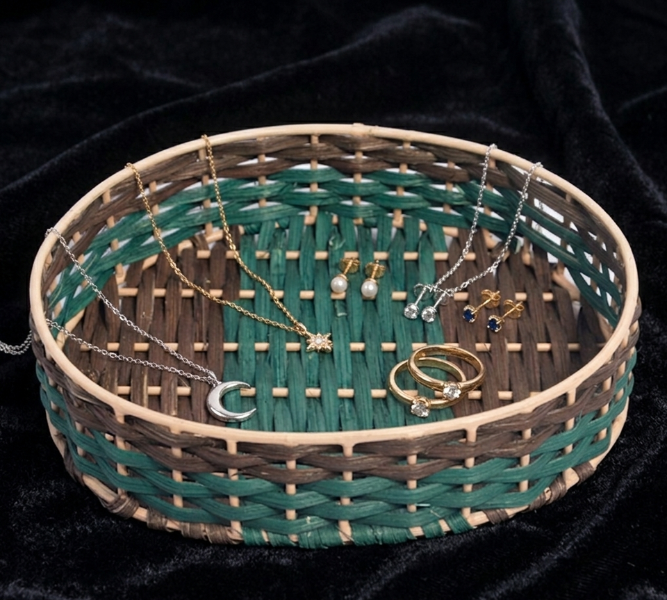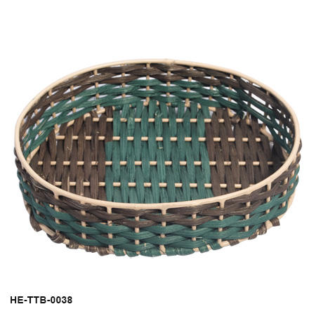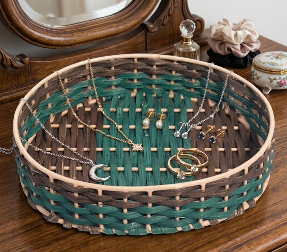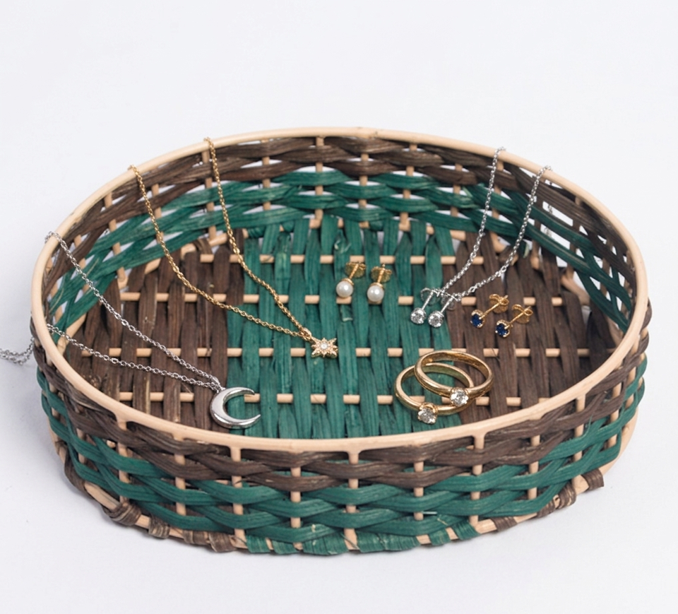 Panier circulaire en rotin artisanal écologique avec un tressage bicolore vert antique et marron sur un cadre durable