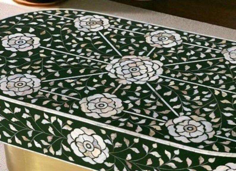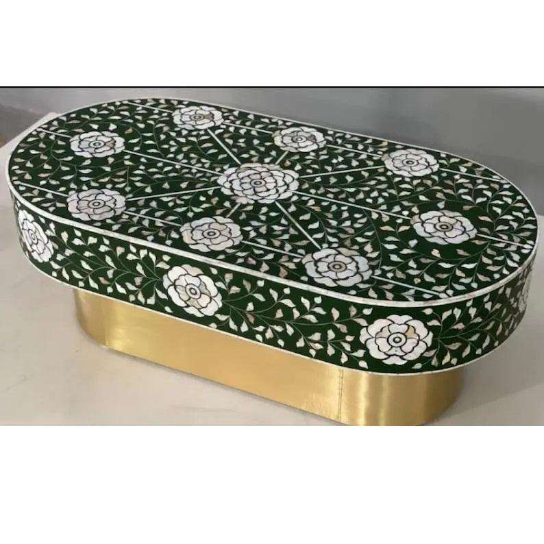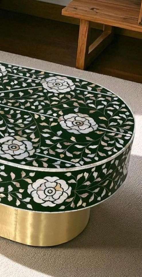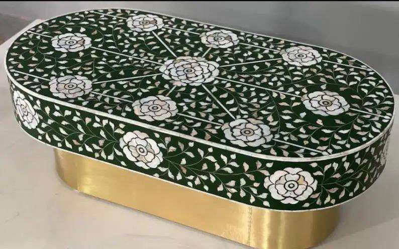 Table basse en bois massif avec incrustations en os, style moderne et écologique, fabrication artisanale de luxe, disponible à un prix raisonnable.