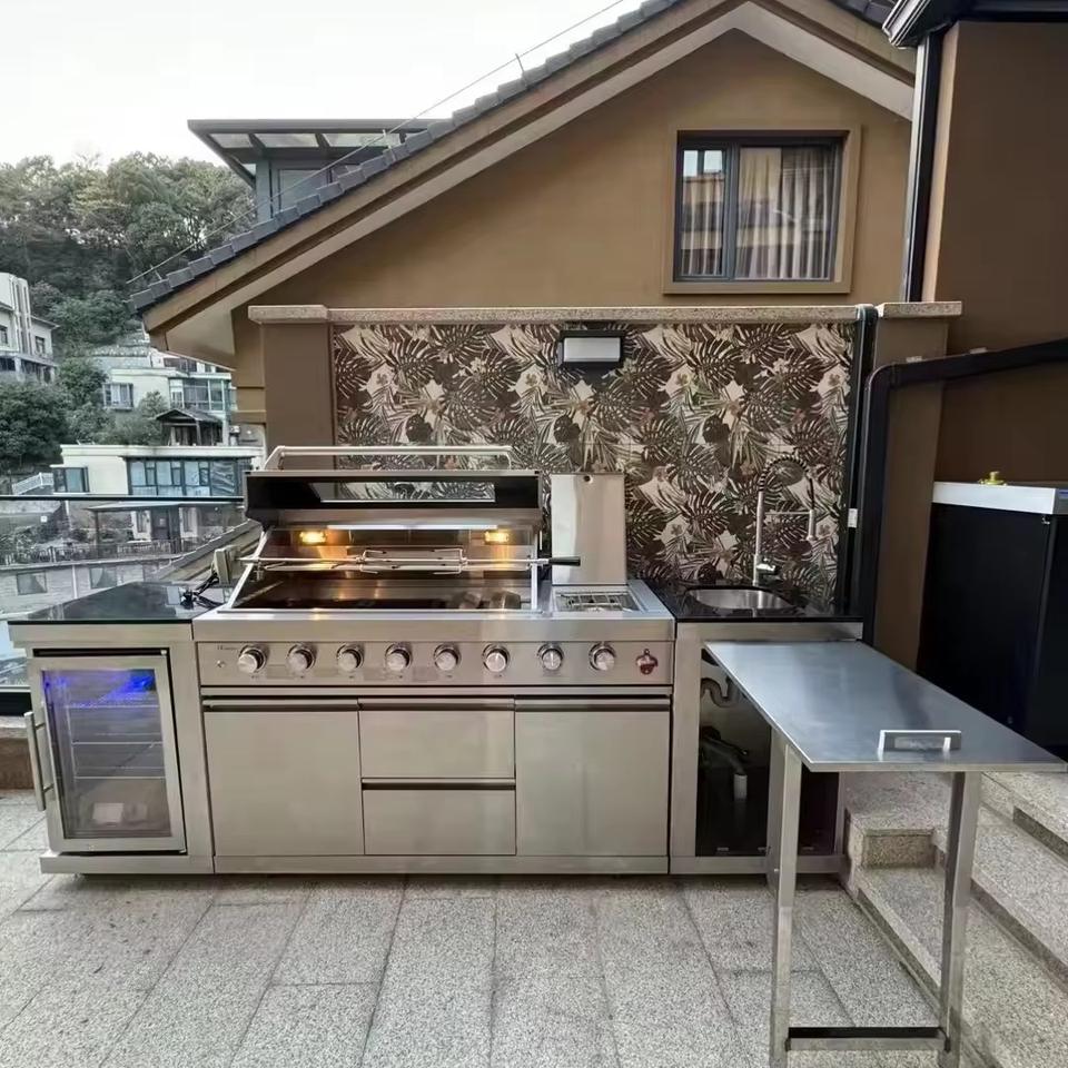 Armoires de cuisine extérieure écologiques en acier inoxydable avec évier, robinet, réfrigérateur, four, porte, meubles, design modulaire