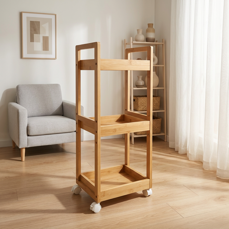 Chariot de rangement multifonctionnel à roulettes, couleur bambou naturel