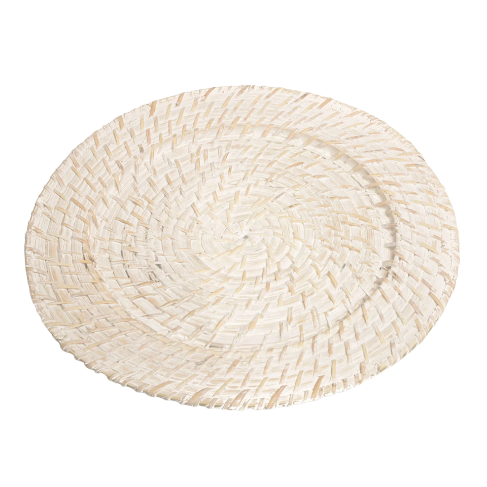 Set de table en rotin naturel tressé écologique blanchi, assiettes de présentation en osier fabriquées par des artisans vietnamiens, décoration de table durable
