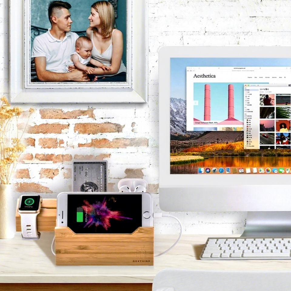 Boîte de rangement pour câbles en bambou massif Eco Go Natural, organisateur de câbles de bureau multifonctionnel, station de charge étanche
