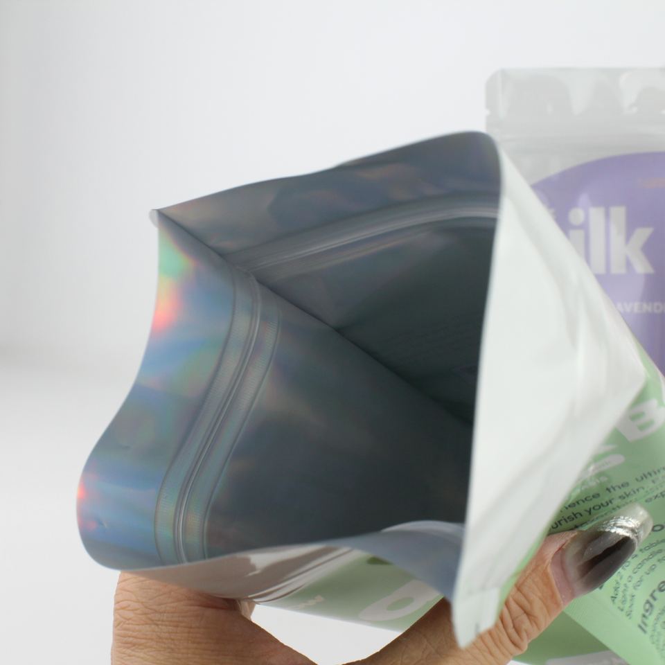 Sac personnalisé écologique à encoche déchirable pour emballage de collation en vrac Sacs debout laser holographique en plastique à fermeture éclair