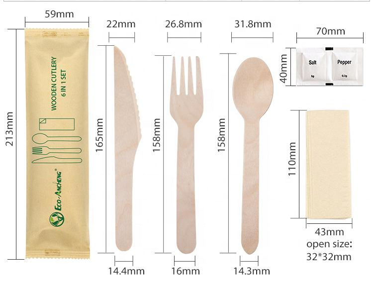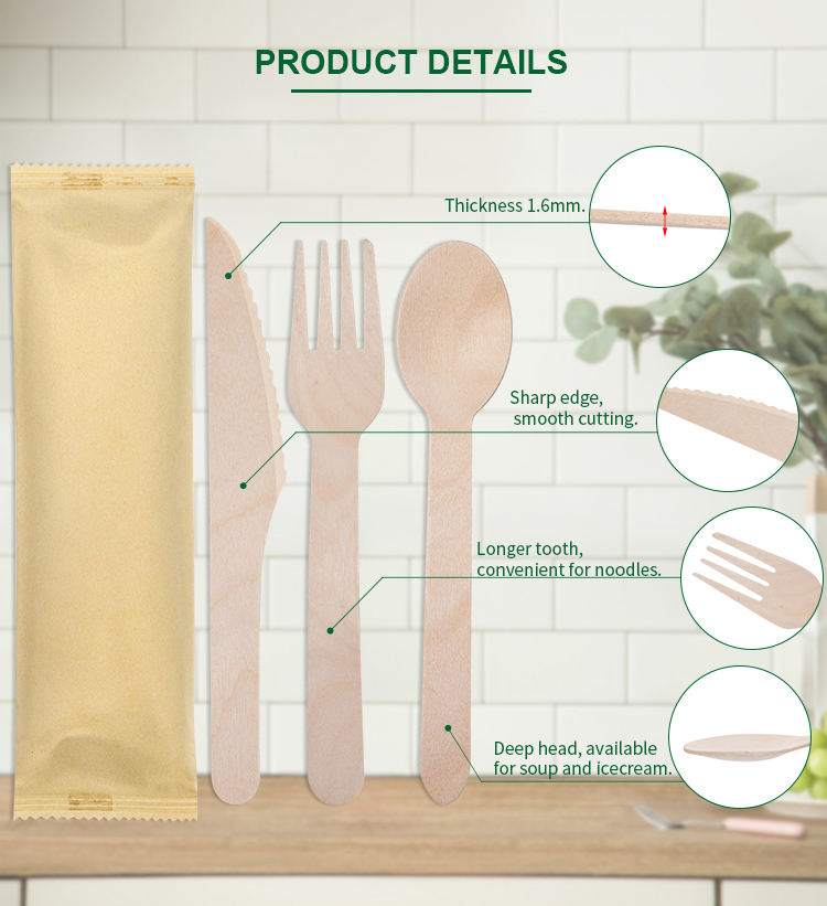 Emballage:1 couteau + 1 fourchette + 1 cuillère + 1 serviette/sac en papier kraft