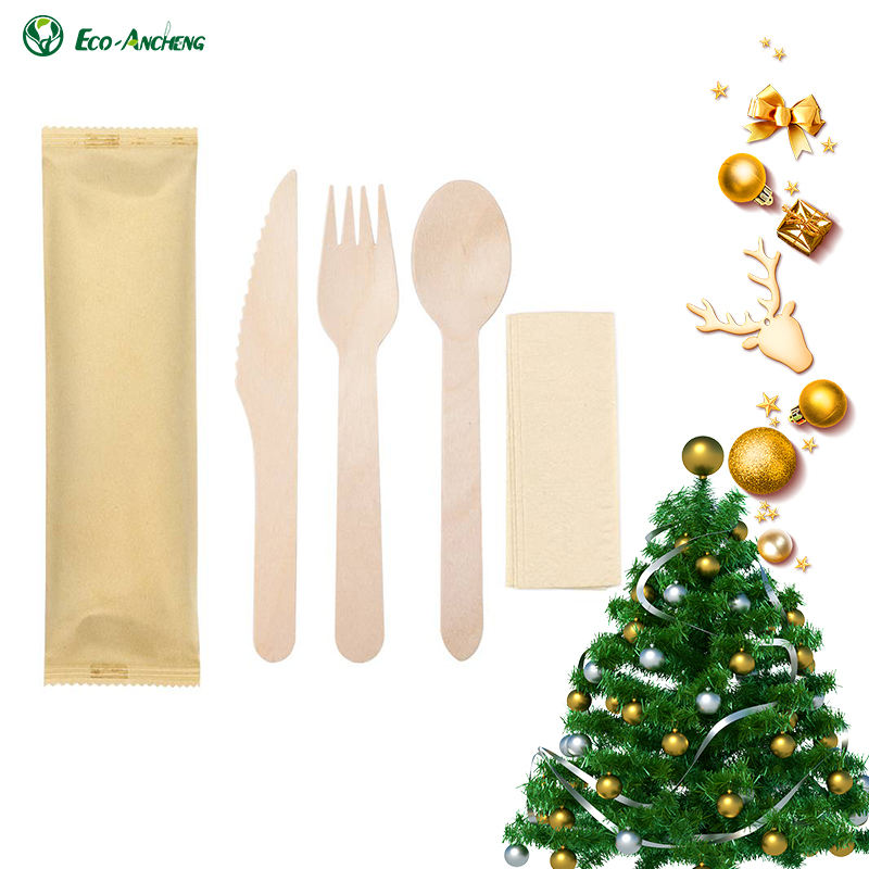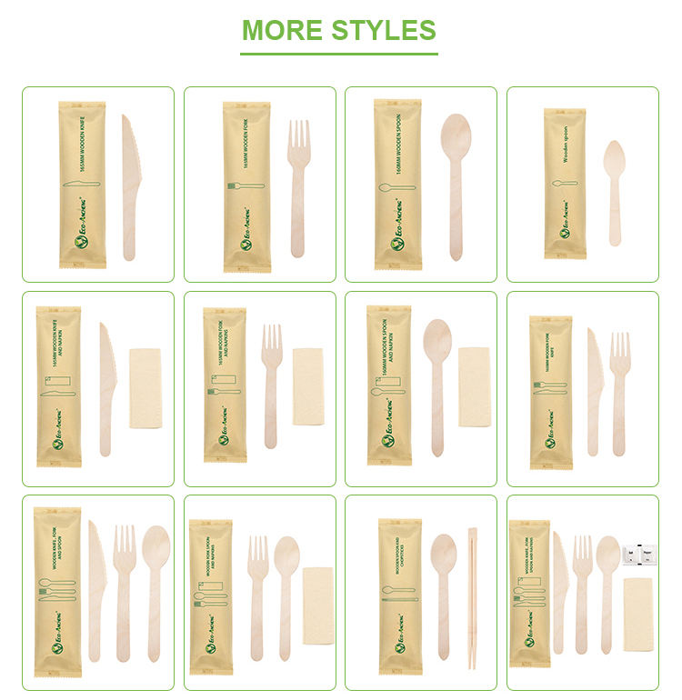 Ensemble de couverts en bois 4 en 1 jetables biodégradables écologiques en vrac en bois de bouleau fourchette cuillère couteau