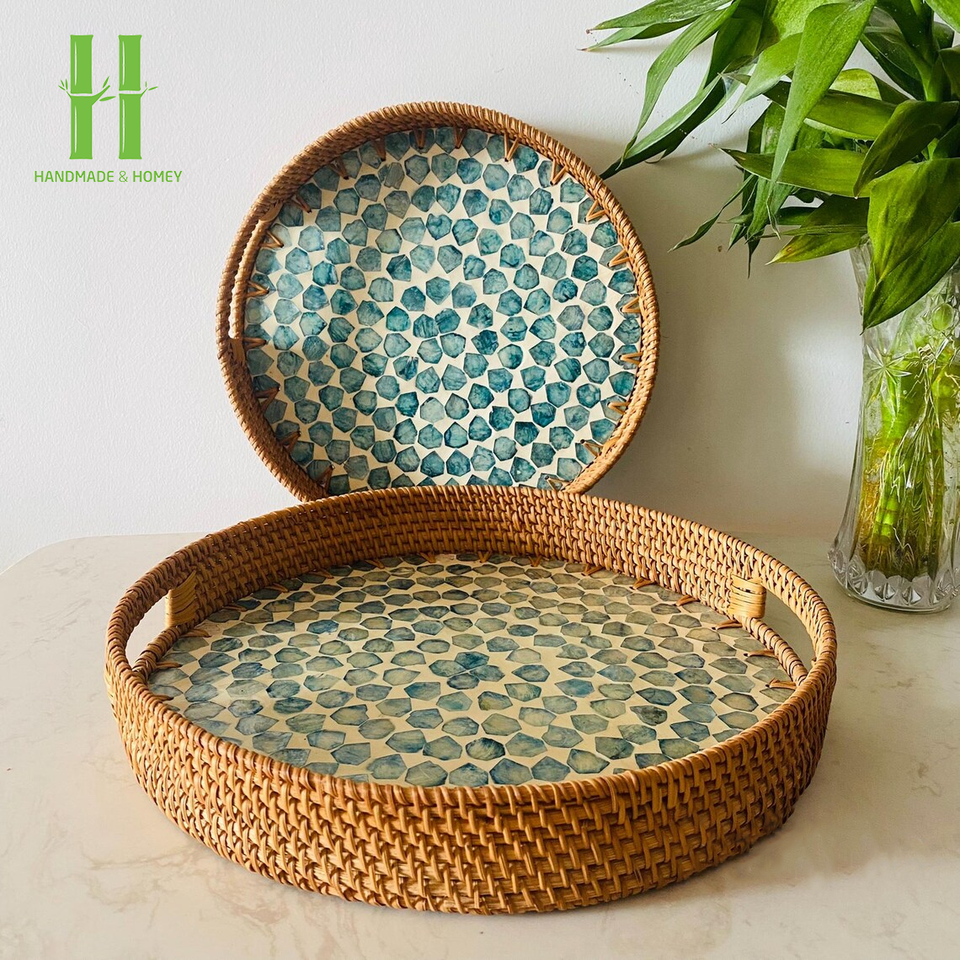 Plateau de service alimentaire décoratif de luxe rond en rotin avec bord en nacre de style vintage fait à la main et respectueux de l'environnement