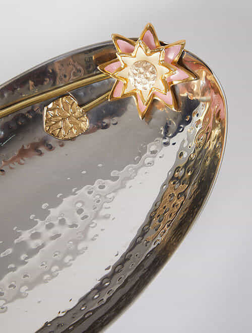 Eco-friendly Silver Metal Decorative Serving Tray with Gold Handles for Home Decor Breakfast & Fruit Tray