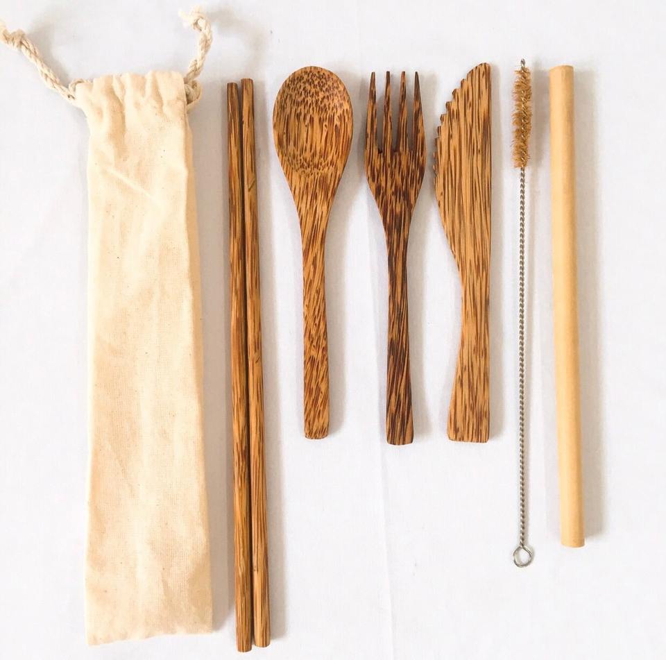 Eco-friendly travel utensil camping knife spoon fork set coco wooden cutlery biodegradable flatware set