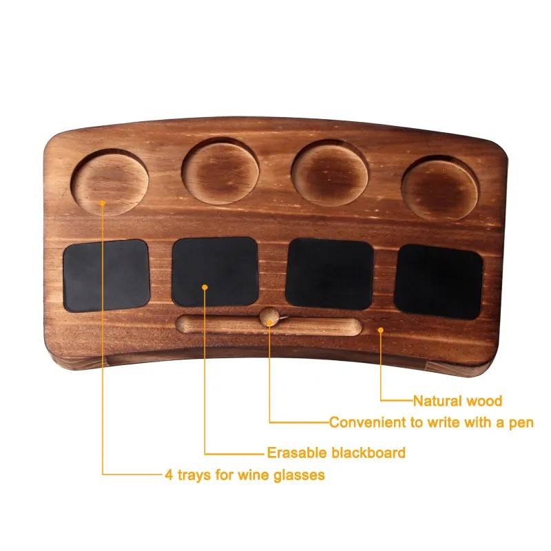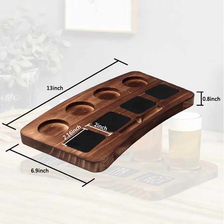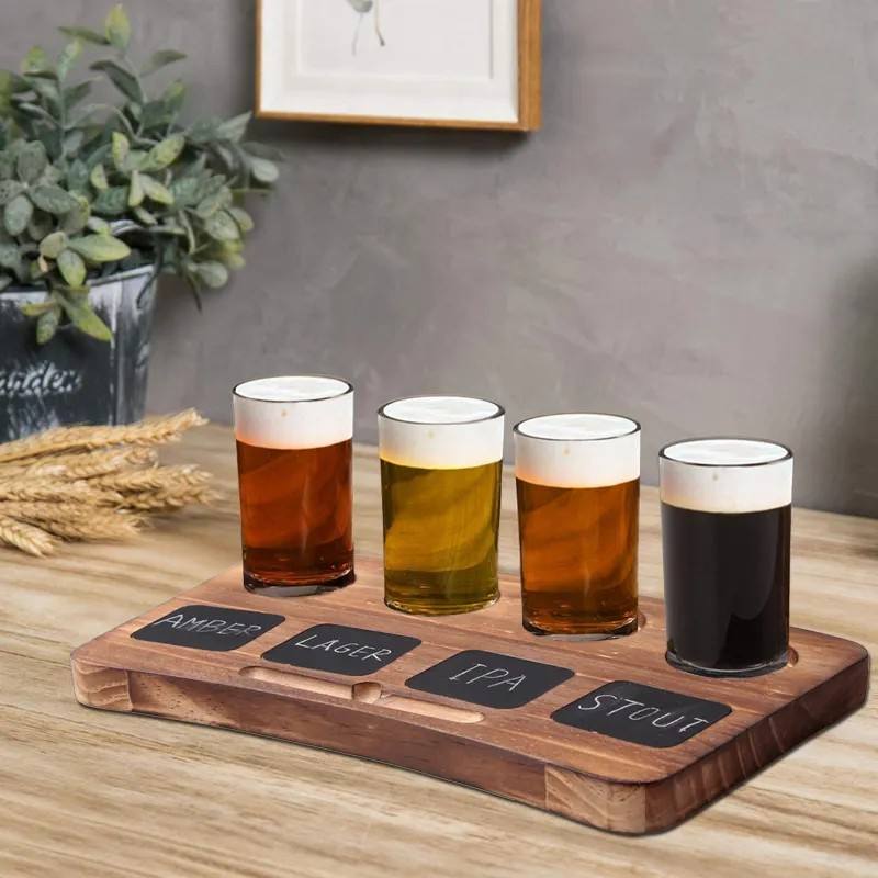 Ensemble d'échantillonnage de dégustation de bière en bois écologique avec tableau noir 4 verres à bière et plateau de transport en bois avec poignées