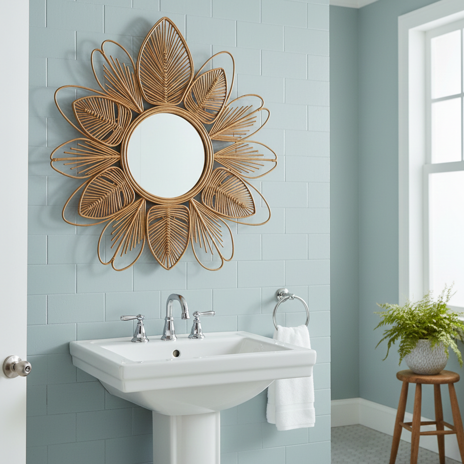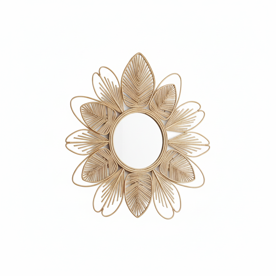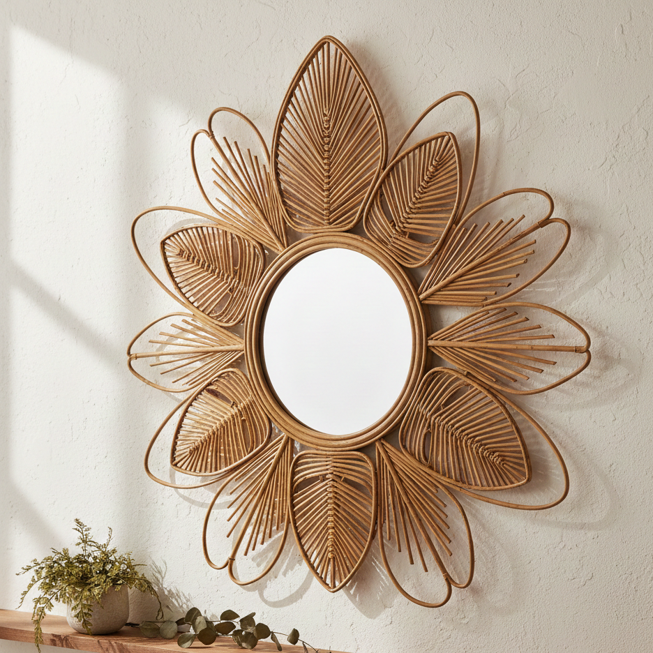 Miroir mural rond bohème en rotin fait main écologique Econa, léger et durable avec bordure encadrée, motif floral décoratif