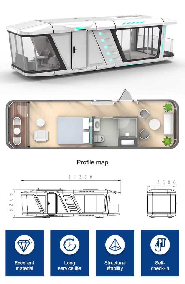 Boutique, Restaurant, Toilettes, Maison vivante de conteneur, Hôtel, Immeuble de bureaux, Hôpital, École, Center commercial, ExtérieurApplication