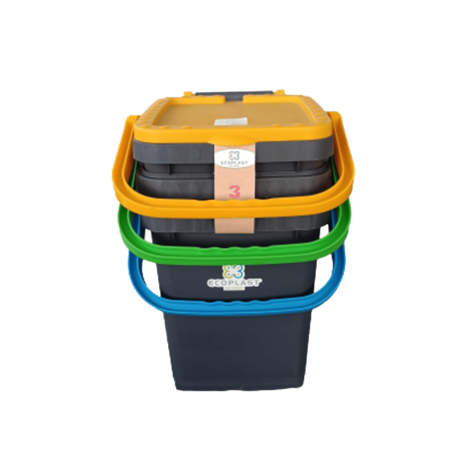 Seau de rangement en plastique Ecoplast pour le recyclage, 20 litres, couleurs assorties jaune/vert/bleu avec couvercles, 345x345x34.5, fabriqué en Italie