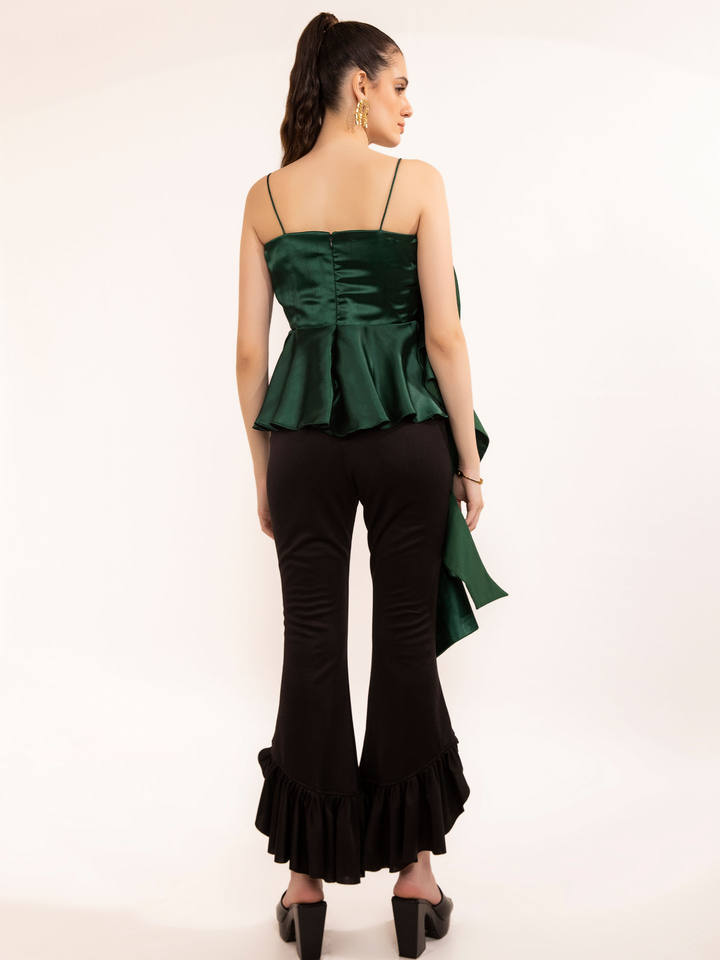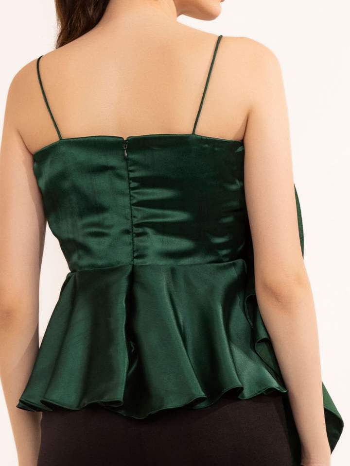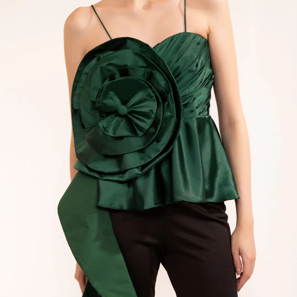 Nom du produit:Top plissé de pilum de satin vert Eden avec rose magnifique significative